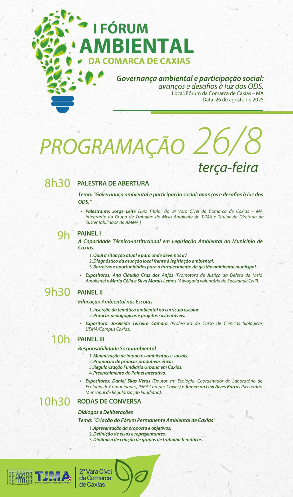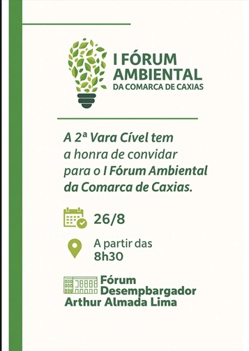 No próximo dia 26 de agosto de 2025, a partir das 8h30, a Comarca de Caxias será palco do I Fórum Ambiental da Comarca de Caxias, organizado pela 2ª Vara Cível. A iniciativa faz parte da mobilização nacional Semana da Pauta Verde, promovida pelo Conselho Nacional de Justiça (CNJ) e realizada até 22 de agosto em todo o país. O encontro acontecerá no salão do júri do Fórum local.