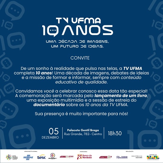 SÃO LUÍS - Primeira emissora universitária do Maranhão e referência entre as TVs públicas brasileiras, a TV UFMA comemora o seu aniversário de dez anos, nesta sexta-feira, dia 05 de dezembro, às 18h30, no Palacete Gentil Braga (Rua Grande, 782 - Centro), em São Luís (MA). A programação especial terá o lançamento do livro ilustrado TV UFMA: Uma década de imagens, um futuro de ideias; a estreia do documentário comemorativo aos 10 anos e a abertura da exposição interativa com a trajetória da emissora.